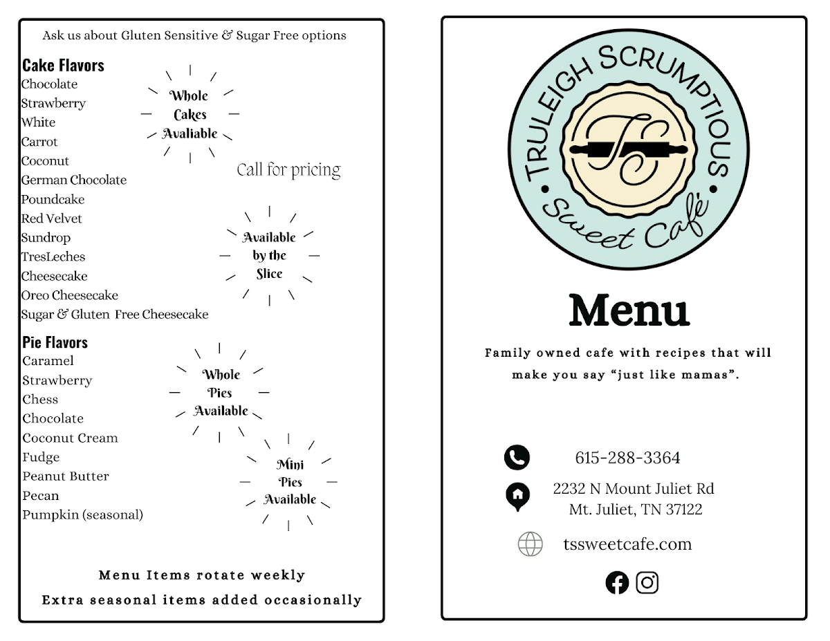 Welcome to Truleigh Scrumptious Sweet Cafe, a delightful culinary haven located at 8965 Stewarts Ferry Pike, Mt. Juliet, TN. This charming cafe is not just about sweet treats; it offers a well-rounded menu that tantalizes the taste buds with a variety of options.